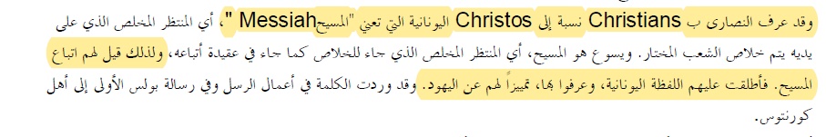 القران هو الصح شئت ام ابيت ! هكذا عقليه المسلم ! لا مش على مزاجك يا مسلم اتباع المسيح اسمهم مسيحين على اسمه وهذا الاسم اطلقه الوحي على اتباع المسيح : ثُمَّ خَرَجَ بَرْنَابَا إِلَى طَرْسُوسَ لِيَطْلُبَ شَاوُلَ. وَلَمَّا وَجَدَهُ جَاءَ بِهِ إِلَى أَنْطَاكِيَةَ. فَحَدَثَ أَنَّهُمَا اجْتَمَعَا فِي الْكَنِيسَةِ سَنَةً كَامِلَةً وَعَلَّمَا جَمْعاً غَفِيراً. وَدُعِيَ التَّلاَمِيذُ «مَسِيحِيِّينَ» فِي أَنْطَاكِيَةَ أَوَّلاً. (أعمال 11: 25-26) فالفعل في الجملة هو χρηματισαι من الجذر اليوناني χρηματίζω chrēmatizō khray-mat-id’-zo وهو يعني الوحي والمصدر الإلهي : crhmatizw chrematizo khray-mat-id'-zo from crhma - chrema 5536; to utter an oracle (compare the original sense of 5530), i.e. divinely intimate; by implication, (compare the secular sense of 5532) to constitute a firm for business, i.e. (generally) bear as a title:--be called, be admonished (warned) of God, reveal, speak. ونضع لعدم الاطاله لان الادله كثيره جدا بان اسمهم هو مسيحين على اسم المسيح وليس نصارى من القديس يوستينوس الذي استشهد عام 165م : For as all shrink from succeeding to the poverty or sufferings or obscurity of their fathers, so whatever the Word forbids us to choose, the sensible man will not choose. That all these things should come to pass, I say, our Teacher foretold, He who is both Son and Apostle of God the Father of all and the Ruler, Jesus Christ; from whom also we have the name of Christians. Whence we become more assured of all the things He taught us, since whatever He beforehand foretold should come to pass, is seen in fact coming to pass; and this is the work of God, to tell of a thing before it happens, and as it was foretold so to show it happening. It were possible to pause here and add no more, reckoning that we demand what is just and true; but because we are well aware that it is not easy suddenly to change a mind possessed by ignorance, we intend to add a few things, for the sake of persuading those who love the truth, knowing that it is not impossible to put ignorance to flight by presenting the truth. Schaff, P. (2000). The Ante-Nicene Fathers (electronic ed.) (1). Garland, TX: Galaxie Software. المسلمين لا يعرفون اصلا ما هي كلمة نصارى ولا ما هو جذرها ولا اصلها فتضاربوا بها اخماس في اسداس لان المسلمين اصلا لا يملكون اي معجم etymology فكل ما يملكة المسلمون هو ترديد ما قاله الخلفاء العباسيون لمعاني الكلمات القرانية كما تخيلوها في السياق دون الغوص في الجذور التاريخيه للكلمة فمعاجمهم ليست اكثر من تخمينات وخزعبلات وتقريبات فقهاء الاسلام ! تعالوا لنرى ما قاله المؤرخ المقريزي عن كلمة نصارى : • "اعلم أن النصارى اتباع عيسى نبيّ الله ابن مريم عليه السلام، سموا نصارى لأنهم ينتسبون إلى قرية الناصرة من جبل الجليل، بالجيم، ويعرفُ هذا الجبل بجبل كنعان، وهو الآن في زمننا من جملة معاملة صفد، والأصل في تسميتهم نصارى أنّ عيسى ابن مريم عليه السلام لما ولدته أمّه مريم ابنة عمران ببيت لحم خارج مدينة بيت المقدس، ثم سارت به إلى أرض مصر وسكنتها زماناً، ثم عادت به إلى أرض بني إسرائيل قومها، نزلت قرية الناصرة، فنشأ عيسى بها وقيل له يسوع الناصريّ، فلما بعثه الله تعالى رسولاً إلى بني إسرائيل، وكان من شأنه ما ستراه، إلى أن رفعه الله إليه، تفرّق الحواريون، وهم الذين آمنوا به، في أقطار الأرض يدعون الناس إلى دينه، فنسبوا إلى ما نسب إليه نبيهم عيسى ابن مريم، وقيل لهم الناصرية، ثم تلاعب العرب بهذه الكلمة وقالوا نصارى ... والتنصر الدخول في دين النصرانية، ونصره جعله كذلك، ((( والأنصر الأقلف، وهو من ذلك، لأنّ النصارى قلف ))) ... ". ( كتاب المواعظ والاعتبار للمقريزي - جزء 2 - ص 482 - دار صادر بيروت ). _______ فاللفظة حسب المؤرخ المقريزي هي مجرد " تحريف " وتشويه وتلاعب اقترفه العرب بغرض الاهانه والتحقير من اتباع المسيح ! الناصري لا تعني النصراني ! الناصرة = ناصري - الناصرية .. وليس : نصراني - النصرانية ! الكلمتين مختلفتين بالنطق وحتى المعنى !!! الناصرة بالعبرانية تعني : الغصن . النصراني بالعربية تعني : الاقلف ( الغير مختون ) حسب قول المقريزي ! المؤرخ جرجي زيدان يعترف بتحريف العرب للاسماء الاعجمية في كتابه العرب قبل الاسلام في الصفحة 166 : https://b.top4top.io/p_1691aogg31.jpg والمؤرخ جواد علي يصرح ان المسلمين متضاربين في الكلمات الغريبه عنهم والتي لا يعرفون لها اصل .. ويصرح المؤرخ انه لا يوجد دليل