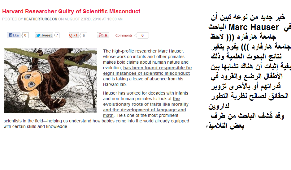 http://www.jpost.com/HealthAndSci-Te....aspx?id=58121 http://www.apologeticspress.org/pdfs.../truthlucy.pdfhttp://1.bp.blogspot.com/-oZOgmpcFTL...64790641_n.jpg http://thefactofcreation.blogspot.co...fraud-the.html http://en.wikipedia.org/wiki/Piltdown_Man http://4.bp.blogspot.com/-FHWMME7EZv..._3388747_n.jpg http://antishobhat.blogspot.com/2012...g-post_15.html http://3.bp.blogspot.com/-x6GioYbesn...55147411_n.jpg http://www.halleethehomemaker.com/20...ry-frauds-pt-x/ https://fbcdn-sphotos-a-a.akamaihd.n...01715607_n.jpg http://en.wikipedia.org/wiki/Taung_Child http://www.press.uchicago.edu/Misc/Chicago/284158_brain.html http://4.bp.blogspot.com/-gmhfxyxh_5...10_73369_n.jpg تم اكتشاف سمكة ظن العلماء انها انقرضت منذ ما يقارب 80 مليون عام اي منذ زمن الديناصورات و لرؤية الوثيقة الاصلية النادرة بخط الانسة مارجوري التي كتبتها لحظة الاكتشاف تشرح فيها تلك اللحظة و اوصاف هذا الكائن تفضلوا على هذا الرابط http://www.pbs.org/wgbh/nova/fish/lett-01.html فضيحة خنزير نبرسكا ظهرت تسمية ( إنسان نبراسكا ) في 1922 اعتمادا على سن شبه - بشري تم العثور عليه في نبراسكا في الولايات المتحدة الأمريكية ، و كما يحكي الخلقيون القصة فإن التطوريين قد استخدموا سناً واحدة لبناء فصيلة كاملة من الإنسان البدائي تشمل رسومات له و لعائلته ، إلى أن توصلت الحفريات لاحقاً أن السن إنما يعود لحيوان شبيه بالخنزير Peccary . http://#######.com/ccs_files/articles/Nebraska.gif القصة الحقيقية هي في الواقع اكثر تعقيداً من ذلك ، ففي عام 1917 قام هارولد كوك ، وهو مزارع و جيولوجي من نبراسكا ، بالعثور على السن ، و في 1922 قام بارساله الى هنري فايرفيلد اوزبورن ، وهو عالم احاثة و رئيس المتحف الامريكي للتاريخ الطبيعي ، و الذي تعرف على السن بأنه يعود لقرد ، و بسرعة نشر مقالة معلناً عن نوع جديد اسماه هيسبيروبيثيكس هارولدكوكي Hesperopithecus haroldcookii . القليل من العلماء الاخرين زعموا أن انسان نبراسكا هو سلف بشري ،حتى بعضهم ، ومنهم اوزبورن و زملاؤه ، وصفوه بأنه نوع متطور بشكل ما من القرود العليا primate ، في الواقع فان اوزبورن تفادى خصيصاً أن يقوم بأي افتراضات مبالغ فيها بخصوص كون هيسبيروبيثيكس إنسان – قرد أو سلف بشري. يقول اوزبورن في 1922 : " لم اصرح بأن هيسبيروبيثيكس هو انسان – قرد او انه جزء من خط السلف البشري المباشر ، فأنا اعتبر أنه من الممكن أن نعثر على قرود شبيه بالانسان ( Simiidae) لها اسنان تحاكي بشدة اسنان الانسان ( Hominidae ) " ، " اذا لم نتحصل على المزيد من الاسنان أو اجزاء من الجمجمة أو الهيكل العظمي فلا يمكننا التأكد اذا كان هيسبيروبيثيكس عضوا من القرود ( Simiidae ) او الانسان ( Hominidae ) " . معظم بقية العلماء كانوا متشككين حتى من الادعاء المتواضع ان السن يعود الى رتبة القرود العليا primate، فببساطة ليس صحيحا بان العلماء كانوا يعدون انسان نبراسكا انسان – قرد او حتى مجرد قرد بل أن تأثيره على التفكير العلمي في ذلك الوقت جدير بالإهمال و لا يذكر . فعلى سبيل المثال في كتاب "اصول الانسان" المنشور خلال ما يفترض انه ذروة قصة انسان نبراسكا في 1924 قام جورج ماكوردي بنبذ انسان نبراسكا في حاشية واحدة : " في 1920 وصف اوزبورن ضرسين من الفترة البليوسينية في نبراسكا ؛ و عزى ذلك لقرد علوي شبيه بالانسان anthropoid primate و اسماه هيسبيروبيثيكس ؛ الاسنان غير محفوظة بشكل جيد و لذلك فان صحة حكم اوزبورن لم يتم قبولها حتى الآن " و قام جريجوري بتأكيد ذلك في مقالة عام 1927 وصف فيها السن بصورة صحيحة : " كان العالم العلمي بعيداً من قبول صحة استنتاج بروفيسور اوزبورن بأن احفورة السن من نبراسكا تمثل انسانا او شبه انسان بدون المزيد من الادلة ." لم يكن تصنيف السن على أنه يعود لرتبة القرود العليا أمراً ساذجاً كما يبدو ، فأسنان الخنزير أو شبيه – الخنزير هي شديدة الشبه بأسنان الإنسان ، و العينة كانت مهترءة و بالية مما جعل التعرف عليها أكثر صعوبة . http://en.wikipedia.org/wiki/Nebraska_Man http://www.talkorigins.org/faqs/homs/a_nebraska.html http://2.bp.blogspot.com/-Zp7KWIu-xk...95173020_n.jpg http://news.smh.com.au/breaking-news...306-1uext.html |
