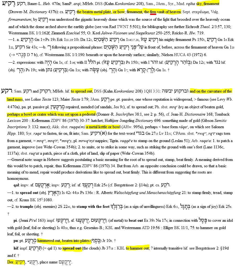 صلابة السماء فى الكتاب المقدس سفر التكويناو الرقيع السماوى في البدء خلق الله السموات والارض. 2 وكانت الارض خربة وخالية وعلى وجه الغمر ظلمة وروح الله يرف على وجه المياه. ........... 6 وقال الله ليكن جلد (رقيع) في وسط المياه.وليكن فاصلا بين مياه ومياه. 7 فعمل الله الجلد(رقيع) وفصل بين المياه التي تحت الجلد والمياه التي فوق الجلد(رقيع).وكان كذلك. ودعا الله الجلد سماء.وكان مساء وكان صباح يوما ثانيا 9 وقال الله لتجتمع المياه تحت السماء الى مكان واحد ولتظهر اليابسة.وكان كذلك. 10 ودعا الله اليابسة ارضا.ومجتمع المياه دعاه بحارا. فى الترجمه العربيه للكتاب المقدس يستخدم كلمة جلد ،لترجمة الكلمة العبريه רָקִיעַ (raqiya) وتنطق بالعبريه (رقيع) ،ونفس الكلمه بنفس النطق تستخدم فى اللغه العربيه بمعنى سماء . "اقتباس من لسان العرب" في الحديث عن قول النبي صلى الله عليه وسلم لسعد بن معاذ رضي الله عنه حين حكم في بني قريظة : لقد حكمت بحكم الله من فوق سبعة أرقعة ، فجاء به على التذكير كأنه ذهب به إلى معنى السقف ، وعنى سبع سماوات ، وكل سماء يقال لها رقيع ، وقيل : الرقيع اسم سماء الدنيا فأعطى كل سماء اسمها . وفي الصحاح : والرقيع سماء الدنيا وكذلك سائر السماوات . مصدر كلمة رقيع العبريه ،الفعل רקע (raqa’) ويعنى ترقيق شئ صلب بالضغط او الطرق عليه ... معنى الكلمه فى معاجم الكتاب المقدس : ١- من المعجم الشهير The Hebrew and Aramaic Lexicon of the Old Testament ![]() كما نرى المعجم فَصًلَ معنى الكلمة وجذرها فى اللغات السامية. ولا يوجد البته إستعمال للكلمة للإشارة لفراغ أو إمتداد من الفراغ . حتى مصدر الكلمة لم يستخدم أبداً لوصف شئ يرتبط بالفراغ ، بل استخدم الفعل بمعنى طرق او سبك او بسط شئ صلب سفر إشعياء 1:18. فبمن تشبهون الله وأي شبه تعادلونه به؟19. إن التمثال يسبكه (رقع) الصانع ويمد الصانع عليه صفائح من الذهب ويصوغ له سلاسل من الفضة. "«هكذا قال السيد الرب: اضرب (رقع) بيدك واخبط برجلك، وقل: آه على كل رجاسات بيت إسرائيل الشريرة، حتى يسقطوا بالسيف وبالجوع وبالوبإ!" (حز 6: 11) "فضة مطرقة (رقع) تجلب من ترشيش، وذهب من أوفاز، صنعة صانع ويدي صائغ. أسمانجوني وأرجوان لباسها. كلها صنعة حكماء." (إر 10: 9). "مجامر هؤلاء المخطئين ضد نفوسهم، فليعملوها صفائح مطروقة (رقع) غشاء للمذبح، لأنهم قد قدموها أمام الرب فتقدست. فتكون علامة لبني إسرائيل»." (عد 16: 38). لم يستخدم ذلك المصدر السابق للكلمه فى الكتاب المقدس الا مع الاشياء الصلبه.... ويضاف لذلك كلام التكوين وقال الله: (( ليكن جلد في وسط المياه وليكن فاصلا بين مياه ومياه )). فكان كذلك. وصنع الله الجلد وفصل بين المياه التى تحت الجلد والمياه التي فوق الجلد. وسمى الله الجلد سماء. والذى يوحى منطقيا بانه إذا كانت وظيفة الرقيع حاجز وسد بين مياه ومياه ،منطقيا سيكون شديد الصلابه ليتحمل المياه العظيمه السماويه (كيف يحمل الهواء بحرا)؟ و أيضاً سفر حزقيال - الأصحاح 1 19. وعند سير هذه الكائنات الحية تسير الدواليب بجانبها، وعند ارتفاعها عن الأرض ترتفع معها الدواليب.20. إلى حيث يشاء الروح كانت تسير هذه الكائنات، والدواليب ترتفع معها، لأن روح هذه الكائنات كانت في الدواليب.21. فعند سير تلك تسير هذه، وعند وقوفها تقف، وعند ارتفاعها عن الأرض ترتفع معها، لأن روح هذه الكائنات كانت في الدواليب. 22. وكان فوق رؤوس هذه الكائنات قبة ( رقيع) كالبلور الساطع منبسطة على رؤوسها من فوق،23. وتحت القبة، كل واحد منها باسط جناحين، واحدها باتجاه الآخر، وبالجناحين الآخرين يستر جسمه..... ونظرت فإذا على القبة التي فوق رؤوس الكروبيم شيء يشبه حجر اللازورد وله منظر العرش. وأيضاً سفر أيوب - الأصحاح 37. 15 هل تدري كيف يتحكم الله في السحب، وكيف يجعل بروقه تومض؟ 16. هل تعرف كيف تتعلق السحب بتوازن؟ هذه العجائب الصادرة عن كامل المعرفة! 17. أنت يامن تسخن ثيابه عندما ترين سكينة على الأرض بتأثير ريح الجنوب. 18. هل يمكنك مثله أن تصفح السماء الصلبة كالمرآة المسبوكة؟ يقول التفسير المسيحى Pulpit Commentary اقتباس: