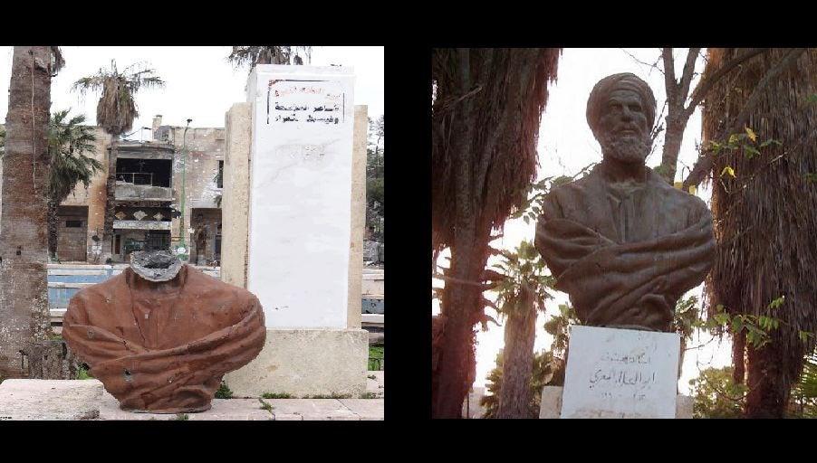 من الطريف أن جبهة النصرة التابعة لتنظيم القاعدة كان من أول ما قامت به عند دخول معرة النعمان مسقط رأس شيخنا المعري هو قطع رأس تمثاله الشهير ...