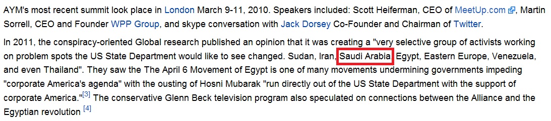 لقد بدأت الخطة المزعومه لتغيير النظام السعودي منذ عام 2008 و لم تكن لتغيير المملكة فقط بل لتغيير الشرق الأوسط بأكمله و ذلك من خلال تأسيس منظمة تسمى AYM : Alliance of Youth Movements و تدعى : اتحاد الحركات الشبابية و لها موقع حركي خاص باسم :Movements.org .. في عام 2008 تم بداية أول اجتماع للمنظمة مع نشطاء شباب من كل أنحاء الوطن العربي يشمل ذلك المملكة السعودية و مصر و تونس و ليبيا و سوريا ... الخ هذه المنظمة تقوم بتدريب الشباب و وضع أجندة لهم للسعي نحو الديمقراطية في بلادهم كل بطريقة خاصة حسب نظام الدولة و ظروفها و تقاليدها .. هذه المنظمة تحت رعاية وزارة الخارجية الأمريكية و ليس هذا فقط بل رئيسها و المشرف الرئيسي فيها هو جاريد كوهين أصغر مستشار أمريكي يهودي في مكتب كونداليزا رايس -صاحبة مشروع نشرالفوضى الخلاقة في الشرق الأوسط- و غير ذلك فإن منظمة موفمنتس هي تفعيل لمشروع جراس روتس أو جذور العشب بالعربية و الذي يرأسه جيمس جلاسمان و هو وكيل وزارة الخارجية للدبلوماسية العامة والشؤون العامة و هو أيضاً منظّر و مؤسس مؤسسة ال Think Tank في زمن جورج دبليو بوش. جراس روتس هي السياسة التي تراد من ال Think Tanks و من المنظمة التي تدعمها و هي AYM و الموقع التنفيذي لها هو : موفمنتس. بمعنى حركة شعبية (في سياق حركة سياسية) فيها السياسة يقودها المجتمع و ليس العكس أي POWER TO THE PEOPLE لمعرفة نبذة عن منظمة موفمنتس شاهد الفيديو لأحد مؤسسيها اليهودي جيسون ليبمان : بدأ الترتيب الفعلي لتغيير الأنظمة في الوطن العربي في اجتماع عام 2008 و هو مذكور على الموقع الأرشيفي للحكومة الأمريكية شاهد الرابط http://www.america.gov/st/democracy-arabic/2008/November/20081121120225amiwahar5.086917e-02.html و شمل التغيير بلاد مثل السودان و إيران و المملكة و مصر - الصورة التالية منقولة من موقع الويكيبيديا عن منظمة موفمنتس - الرابط : http://en.wikipedia.org/wiki/Alliance_of_Youth_Movements ملحوظة : لتوضيح الصور يرجى الضغط عليها و لكن كيف يتم التغيير في المملكة ؟؟ في اجتماع ديسمبر 2008 تم تحديد الأجندات الخاصة بتغيير الدول المطلوبة من قبل الولايات المتحدة الأمريكية و بالنسبة للمملكة العربية السعودية تم تحديد التغيير بالمطالبة بحقوق المرأة السعودية و المطالبة بمنح رخص للسيارات في المملكة - ملاحظة الصورة القادمة من موقع المنظمة منذ عام 2008 و هي صورة من الأجندة التي تم تحديدها لتغيير المنطقة - الرابط :http://info.howcast.com/youthmovements/summit/agenda مذكور الآن على موقمع منظمة موفمنتس إذا أردت للربيع العربي أن يصل إلى المملكة فعليك بثورة نسائية و هدفهم هو عمل الثورة من خلال النساء أي ثورة نسائية في بلاد الحرمين !!!!! و الآن بعد أن عرفنا المنظمة و الأجندة المطلوبة حان وقت معرفة الأعضاء المشاركين في البرنامج وهم مذكورين عن طريق منظمة أخرى تسمى Cyberdissidents.org أو صناعة المعارضة و هذه المنظمة لديها أعضاء في كل منطقة العالم العربي و بالطبع في المملكة !!! لماذا يهتمون فقط بالعالم العربي ؟؟؟ الإجابة بعد الصورة القادمة ذلك لأن أحد مستشارين منظمة Cyberdissidents هو برنارد لويس صاحب مخطط تقسيم و تفكيك العالم العربي "برنارد لويس" و هو أعدى أعداء العرب بوجه عام و المسلمين بشكل خاص وفى عهد جيمي كارتر الذى كان رئيسا لأمريكا فى الفترة من 1977- 1981 تم وضع مشروع التفكيك, الذى وضعه هو"برنارد لويس" المستشرق الأمريكي الجنسية, البريطاني الأصل، اليهودي الديانة، الصهيوني الانتماء الذى وصل إلي واشنطن ليكون مستشارًا لوزير الدفاع لشئون الشرق الأوسط. وهناك أسس فكرة تفكيك البلاد العربية والإسلامية, ودفع الأتراك والأكراد والعرب والفلسطينيين والإيرانيين ليقاتل بعضهم بعضًا، وهو الذى ابتدع مبررات غزو العراق وأفغانستان !! وجود برنارد لويس كالمستشار الأول لبرنامج Cyberdissidents مذكور على الويكيبيديا في الرابط التالي : http://en.wikipedia.org/wiki/CyberDissidents.org و مذكور أيضاً على موقع المنظمة. و باقي المشرفين و المنظمين على الرابط التالي و مؤسس المنظمة هو ديفيد كيز الصهيوني و ديفيد يعمل في منظمة أديلسون للدراسات الاسترا