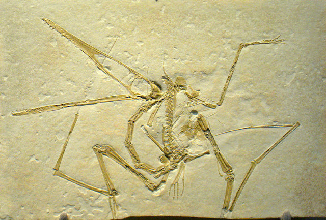 كما قرأنا سابقاً, فقد كانت التيراصورات أوائل الفقاريات التي استطاعت الطيران في الأجواء. وقد حققت هذا الأمر قبل الطيور بمئة مليون عام تقريباً, وقد حافظت على طيرانها حتى الانقراض الكبير قبل 65.5 مليون عام, حيث انقرضت كل الديناصورات بتلك اللحظة. تكون أحفورياتها الأكثر جمالاً وهي متوفرة نسبياً. رغم كل هذا, فنحن نعرف القليل عن حياتها والأقلّ حول استراتيجيتها بالطيران. إحفور نوع Pterodactylus antiquus, كأوّل تيراصور جرى وصفه. وتُعتبر تقنيّة الإقلاع أحد أهم الألغاز الكبرى. فقد اقترحوا نماذج تفسير هامّة تستحق الوقوف عندها. حيث يُشير النموذج الأوّل لأنها قد سقطت من اماكن مرتفعة وقد تكفّلت التيارات الهوائيّة برفعها في الهواء الطلق. أما النموذج الثاني, فيعتبر أن تلك الحيوانات قد خفقت بأجنحتها على الأرض لكي تكتسب القدرة على الطيران { وهذا النموذج ما سنسميه نموذج " التأهُّب aviar " }. كذلك اعتبر نموذج ثالث بأنّ تلك الزواحف قد استخدمت أجنحتها المثنيّة لدفعها بالهواء من الأرض وهكذا حققت الارتفاع بأول خفقة جناح { وهذا النموذج سنسميه بنموذج " الخفّاش مصّاص الدم " }. نموذج منحدرات الجرف. حيث نجد لليسار نوع Ornithocheirus وإلى اليمين نوع Criorynchus. إيضاح John Sibbick. نموذج التأهُّب aviar. في الصورة هيكل عظميّ لنوع Pteranodon مع أغشية جناحيّة جرت اعادة بنائها. مأخوذة من Pterosaur Heresie. نموذج الخفاش مصاص الدم. في الفيديو نرى الجنس Anhanguera. جرت اعادة بناؤه من قبل Julia Molnar يكون النموذج الأوّل غير مُقنع كثيراً, بحيث يبدو وكأنّ التيراصورات في الأرض قد كانت غير مفيدة كليّاً, وعمليا قد كانت ميِّتة. يكون النموذجان الثاني والثالث الأكثر نقاشاً بين علماء الإحاثة, ويشكّل النموذج aviar الأكثر قبولاً. أما نموذج الخفّاش مصّاص الدم: ففيها نقاط ضعيفة, لا تُنهيها ولكن تقلِّل من قيمتها عند غالبيّة التيراصورات. النموذج الأقل ترجيح هو القفز رباعي الأطراف. ففي الصورة, التيراصور نوع pterosaurio Tupuxuara, إيضاح Julia Molnar. |
