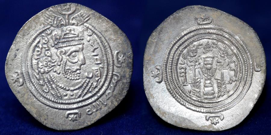 بخصوص معاويه أكثر عملاته ضربت في ايران لكن الأمر لا يقتصر على معاويه معاويه وابن الزنبيل والمهلب بن ابي صفرة وسمره بن جندب وزياد بن ابيه والبراء بن قبيصه والحجاج ابن يوسف الثقفي وغيرهم الكثير ضربوا عملاتهم على الطراز الساساني محتفظين بصوره خسرو برويز وتاجه وعرشه لأكثر من 70 عام رغم انه كان باستطاعتهم تغييرها بل استمروا على نفس الطراز الكسروي لان كسرو برويز ملك المؤمنين )كان الملك والحاكم لهولاء القاده لكن الأهم من ذلك هناك عملات للحاكم الساساني يزدجرد الثالث وفي فتره حكمه سنه الجلوس 20 (توافق علم 31 هجريه ) مكتوب عليها بسم الله وهنا السؤال لماذا حاكم ساساني يكتب هذه العبارة ان لم يكن من المؤمنين النسطورريين !!! اما تعريب العملات فقد بدأ بعهد شهرباراز نفسه (عمله لشهرباراز توافق 7 هجريه 629 م (مكتوب عليها جيد باللغه العربية ) ومعروف ان الفرس شاركوا بوضع قواعد اللغه العربية فسيبويه فارسي ! الفرق بين كل هولاء القاده والقائد شاهين ان الأخير انشق عن خسرو برويز اثناء حياته ثم بدأ تكوين جيش شمال الجزيرة العربية بمساعده اليهود والعرب ومن معه من الهاجريين او الطيايا فبدأ يهاجم الفرس والروم ساعده في ذلك ضعف الدوله الساسانيه بعد مقتل خسرو برويز على يد ابنه قباذ الثاني وكذلك انهاك الطرفين البزنطي والفارسي من الحرب الطويله بينهم ![]() عمله يزدجرد الثالث باسمه وسنه الجلوس 20(يوافق3 1 هجريه ) Drachm in the Name of Yazdegerd III, 31 AH |