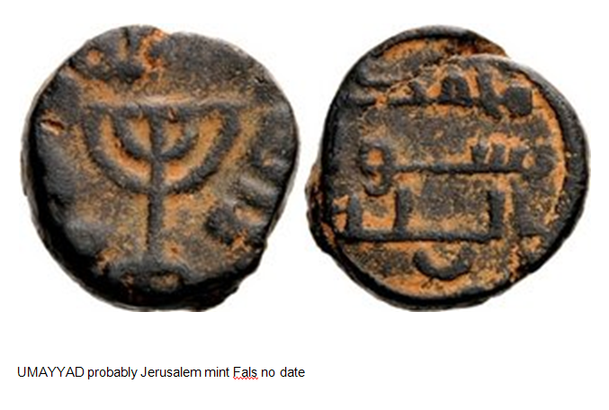 طالما تتكلموا عن العملات فهذه عملة تعود للبدايات الأولى للحكم العربي موجود على جهة من العملة عبارة محمد رسول الله والجهة الأخرى الشمعدان اليهودي وحول الشمعدان محمد رسول الله.