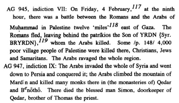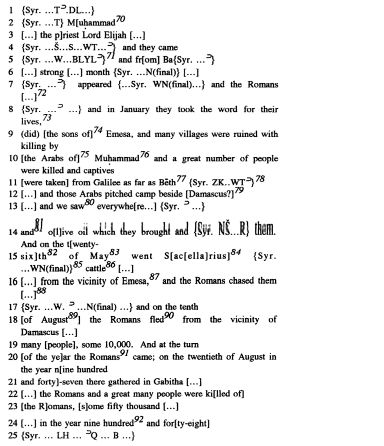 وفي القصاصة عبارة "نحن رأينا" وهي دليل إيجابي أن المؤلف معاصر للأحداث. جاء في القصاصة (2): ![]() "في يناير قَبِلَ أبناءُ إيميسا معاهدة الصلح، وكثير من القرى دُمِّرَت بسبب القتل من قِبَلِ عرب محمد، وقُتِلَ عدد كبير من الناس وسيق الأسرى من الجليل على مسافة من مدينة بث وهؤلاء العرب أقاموا معسكرًا بجوار دمشق ورأينا كل مكان وزيت الزيتون الذي جلبوه معهم. وفي 26 مايو ..... وفي 10 اغسطس هرب الروم من منطقة قرب دمشق .... ومع أفول العام (634 - 635م) جاء الروم ....." وتؤرخ الوثيقة المعركة التالية (في جابيثا) بالتاريخ 20 أغسطس 636م الذي يتفق تمامًا مع التأريخ العربي لمعركة نهر اليرموك ...." أي أن عرب محمد (المسلمون) هم الذين كانوا يقاتلون الروم في الشام سنة 636م 1- W. Wright, Catalogue Of Syriac Manuscripts. London, No. XCIV, pp. 65-66. 2- Andrew Palmer. The Seventh Century In The West-Syrian Chronicles Including Two Seventh-Century Syriac Apocalyptic Texts, 1993, Liverpool University Press, UK, 1993. P1-4. |