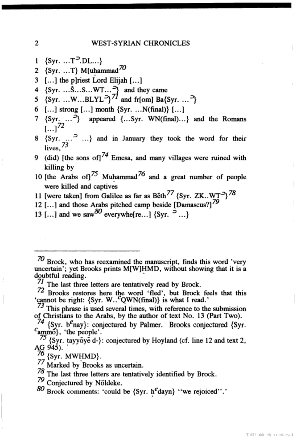 لفت الأستاذ Wright النظر إلى مخطوطة الأسقف توما Thomas The Presbyter التي يعود تاريخها إلى 635م. وقد جاء قي نص المخطوطة تاريخان مهمان (1): ![]() "في يوم الجمعة 4 فبراير (634م) في الساعة التاسعة وقعت معركة بين الروم وعرب محمد في فلسطين على بعد 12كم شرق غزة. هرب الروم تاركين برايدن الذي قتله العرب. كما قُتِلَ 4 آلاف من القرويين الفلسطينيين ومن المسيحيين واليهود والسامريين. لقد انتقم العرب من المنطقة كلها. (سنة 636م) غزا العرب كل سوريا واتجهوا إلى فارس وغزوها وصعدوا جبل ماردن وقتلوا رهبانًا كثيرين هناك في دير قيدار وبينوثو. وهناك مات الرجل المبارك سيمون حارس قيدار شقيق القس توما." يعلق الأستاذ Hoyland على هذا، فيقول: Its precise dating inspires confidence that it ultimately derives from first-hand knowledge. (2) "تأريخها الدقيق يبعث على الثقة أن هذا الكلام يصدر حتمًا من المصدر الأول للمعرفة." 1-Andrew Palmer. The Seventh Century In The West-Syrian Chronicles Including Two Seventh-Century Syriac Apocalyptic Texts, 1993, Liverpool University Press, UK, 1993. P.18,19. 2- R. G. Hoyland, Seeing Islam As Others Saw It: A Survey And Evaluation Of Christian, Jewish And Zoroastrian Writings On Early Islam, 1997, op. cit., p. 120. |