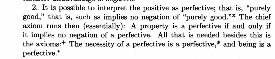 1. كان مجرد هامش توضيحي من الكاتب، لم يكن في تعريف البرهان، هو مجرد محاولة من الكاتب لتعريف ما يقصد به غودل 2. التعريف لم يحدد نوعية ايجابي غير انه خير مطلق، لا يوجد به شر... فهذا مجرد تلاعب.. لا يوجد تعريف كما قدمت: اقتباس:
