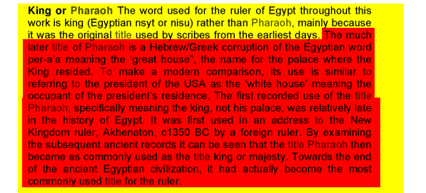 ![]() ولو رجعت لكتاب The Essential World History لجاكسون وليم تجد ان من الالقاب التى كان يلقب بها الملوك المصريين هو فرعون وتعنى اصلا البيت العظيم اشارة للقصر الملكى : ![]() وهو نفس ما قاله ادريان كير بالحرف فى كتابه Ancient Egypt and Us: The Impact of Ancient Egypt on the Modern World ![]() ففرعون هو نطق يونانى وعبرى لكلمة بر عا بمعنى البيت العظيم وكان يطلق على البيت الملوكى مشابهه لنفس الاسلوب لما نتكلم عن الرئاسة الامريكية بمصطلح البيت الابيض معناها من يسكن مقر اقامة الرئيس لكن كلمة فرعون اشارت للشخص وليس للقصر ولما تفحص السجلات القديمة ستجد ان اللقب اصبح شائع فى استخدامه كلقب للملك وفى نهاية الحضارة المصرية القديمة اصبح لقب فرعون هو اللقب الشائع للملك المصرى ولو رجعت لسفر التكوين ايام ابراهيم يقول اسم فرعون بدون اسم اخر حتي بعد زمن موسي ولكن في زمن ملوك اسرائيل يبدا يقول الاسم بجانب لقب فرعون مما يتطابق مع التاريخ مثل : الملوك الثاني 23: 29 فِي أَيَّامِهِ صَعِدَ فِرْعَوْنُ نَخْوُ مَلِكُ مِصْرَ عَلَى مَلِكِ أَشُّورَ إِلَى نَهْرِ الْفُرَاتِ. فَصَعِدَ الْمَلِكُ يُوشِيَّا لِلِقَائِهِ، فَقَتَلَهُ فِي مَجِدُّو حِينَ رَآهُ. إرميا 44: 30 هكَذَا قَالَ الرَّبُّ: هأَنَذَا أَدْفَعُ فِرْعَوْنَ حَفْرَعَ مَلِكَ مِصْرَ لِيَدِ أَعْدَائِهِ وَلِيَدِ طَالِبِي نَفْسِهِ، كَمَا دَفَعْتُ صِدْقِيَّا مَلِكَ يَهُوذَا لِيَدِ نَبُوخَذْرَاصَّرَ مَلِكِ بَابِلَ عَدُوِّهِ وَطَالِبِ نَفْسِهِ». فكما اثبتنا سابقا من مراجع علميه ان اسم فرعون قديم من قبل القرن الثامن عشر قبل الميلاد بمعني انه هو الاله وهو البيت العظيم كون من بعد مينا موحد القطرين سميت مصر بالبيت الكبير وممثل في فرعون الاله ابن الالهة هو بر عا اي البيت الكبير وفي فتره زمنيه اطلق فرعون علي البعض من الهكسوس بمعني طغاه واستمر كاسم ملك مصر بعد خروجهم ولكن في عصر الاسره الحديثه بدا يطلق كلقب بجانب الاسم وهذا يذلك انه في زمن ابراهيم وبعده في زمن يوسف وموسي كان فرعون اسم وبعد ذلك اصبح لقب بجانب الاسم. |