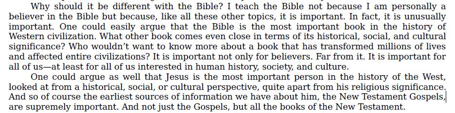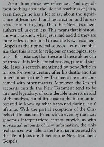الرجل يقول إن الرجوع للكتاب المقدس لأسباب تاريخية "محضة" لأننا ليس لدينا مصادر أخرى والمصادر الأخرى المعاصرة للمسيح لم تهتم به (راجع ما قاله في بحثه، لا وقت لديّ لنقل كل هذه النصوص مثلك)، ويقول في ذات الوقت إن الكتاب المقدس مليء بالتخاريف. أما أنت فبقدرة قادر حرّفت العبارة إلى "ولنقائها وبساطتها" وهذا أحط من الكذب، وجعلته يثبت صحة الكتاب المقدس بينما هو يثبت العكس. اقتباس:
