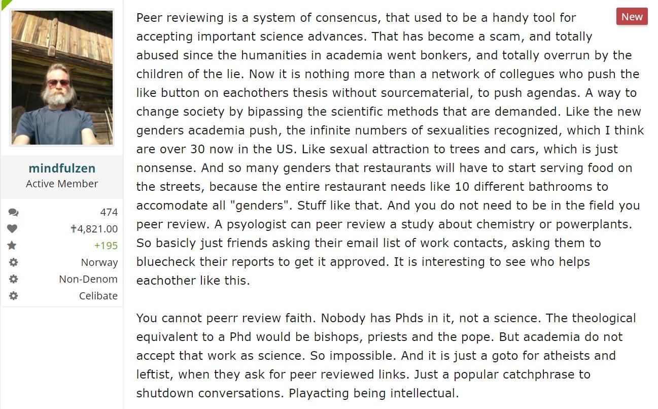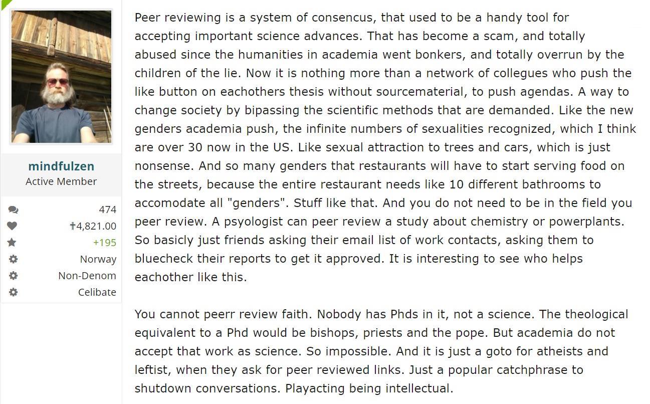 Peer reviewing is a system of consencus, that used to be a handy tool for accepting important science advances. That has become a scam, and totally abused since the humanities in academia went bonkers, and totally overrun by the children of the lie. Now it is nothing more than a network of collegues who push the like button on eachothers thesis without sourcematerial, to push agendas. A way to change society by bipassing the scientific methods that are demanded. Like the new genders academia push, the infinite numbers of sexualities recognized, which I think are over 30 now in the US. Like sexual attraction to trees and cars, which is just nonsense. And so many genders that restaurants will have to start serving food on the streets, because the entire restaurant needs like 10 different bathrooms to accomodate all "genders". Stuff like that. And you do not need to be in the field you peer review. A psyologist can peer review a study about chemistry or powerplants. So basicly just friends asking their email list of work contacts, asking them to bluecheck their reports to get it approved. It is interesting to see who helps eachother like this. You cannot peerr review faith. Nobody has Phds in it, not a science. The theological equivalent to a Phd would be bishops, priests and the pope. But academia do not accept that work as science. So impossible. And it is just a goto for atheists and leftist, when they ask for peer reviewed links. Just a popular catchphrase to shutdown conversations. Playacting being intellectual. |