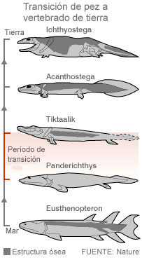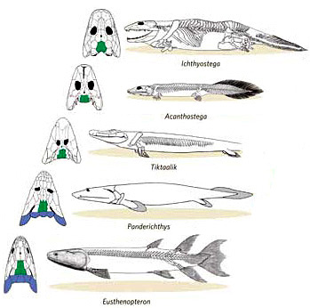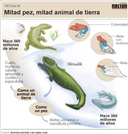 تِكْتالِك (بالإنجليزية: Tiktaalik)، هي سمكة تميزت بالأقدام، وهي من الحيوانات المنقرضة. في منطقة القطب الشمالي تم اكتشاف أحفورة fossil تدعى بتيكتاليك روسية Tiktaalik Roseae وهو من الاحافير في المراحل الانتقالية ويظهر الاحفور بشكل واضح كيف تطورت بعض الاسماك إلى حيوانات بريّة. ویعتقد العلماء بأن ذلك الحیوان یمکن أن یمثل أحد أهم أجداد الحیوانات البریة عندما بدأ بالخروج من الماء إلى الیابسة. رياح باردة ودرجات حرارة منخفضة مجمّدة والكتل الضخمة المنجمدة والتهديدات البيئية المستمرة للدبب القطبية دفعت مجموعة من ثلاثة العلماء رحلة بحث في تلك المنطقة واكتشفوا بالصدفة الاكتشاف العظيم في حياتهم. المنطقة القطبية التي بحثوا فيها هي جزيرة أللسميرة الكندية Ellesmere وهذه المنطقة كانت يسودها قبل 383 مليون سنة طقس شبه استوائي لطيف الحرارة. هذه المنطقة كانت تقع في كتلة الأرض (قارة) الأوروأمريكية (أمريكا حينها كانت مرتبطة جغرافيا بأوربا) في العصر الديفوني Devonian period، وهذه المنطقة كانت تقع في تلك الفترة قرب خط الاستواء. تلك المنطقة في ذلك الزمن كانت مليئة بالأنهار الصغيرة المتعرجة وكذلك القنوات المائية الضحلة وتلك البيئة كانت مثالية للسمكة المتردّدة في الزحف إلى اليابسة هذا ما يقوله العلماء الثلاثة تيد دايشلر Ted Daeschler ونيل شوبين Neil Shubin وفارش جنكينس Farish Jenkins. بدأت بعثتهم في سنة 1999 ولحد الآن وجدوا مئات بقايا العظام في صخور متجمدة, ولكن الاكتشاف المميّز كان في سنة 2004 عندما وجدوا ثلاثة نماذج من الاحافير التي كانت في المراحل الانتقالية من التطور بين السمك والحيوانات البريّة, اسم هذا الحيوان هو Tiktaalik Roseae تيكتاليك روسية والاسم يأتي من اللغة المحلية هناك في اللغة الانوكتيكوك Inuktikuk ويعني سمكة كبيرة في المياه الضحلة. إعادة بناء التيكتاليك فنيّاً النوع السَلَفْ لتيكتاليك كان نوع مُنقرِضْ من لحميّات الزعانف، وقد أسموه Eusthenopteron كما هو واضح بالصورة أعلاه يليه التكيتاليك ذاته ككائن انتقالي نحو الحياة البريّة يليه نوع خَلَفْ برّي من رباعيّات الأطراف المنقرضة، وقد أطلقوا عليه الاسم Ichthyostega. مقارنة منطقة الرقبة عند الأنواع الثلاثة المُنقرضة المذكورة في الصورة أعلاه يكون التيكتاليك عملياً نصف سمكة + نصف حيوان برّي! وفي الصورة مقارنة بين أطراف وزعانف الحيوانات الثلاثة المُنقرضة ذاتها تبيان وضع التيكتاليك بين أنواع بحرية منقرضة وأنواع بريّة منقرضة مقارنة المنطقة الرأسية عند تيكتاليك وأنواع سالفة ولاحقة موقع أطراف التيكتاليك في تطوُّر أطراف بعض الأنواع الحيّة يتبع ![]() ![]() |