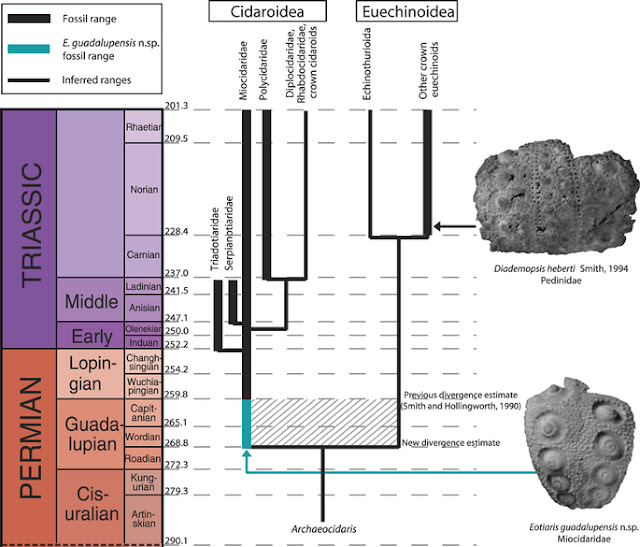 ينتمي القنفذ الأوروبيّ Erinaceus europaeus إلى رتبة آكلات الحشرات مثل الطوبينيات وزبابيات الفيل، وتتقاسم معها مزايا متشابهة تشريحياً ووراثياً. يكون جميع القنافذ أعضاء في عائلة Erinacéidos { والتي بدورها عائلة فرعية من القنافذ Erinaceinos }. عثروا بحقبة سبعينيات القرن الماضي على إحفور في منغوليا، يعود لحقبة الكريتاسي المتأخّر، أسموه Zalambdates وكان يعود لنوع من الثدييات صغير الحجم آكل للحشرات وبعمر 60 مليون عام، وعلى مما بدا فقد مثّل السلف لجميع قنافذ Erinacéidos الحاضرة في أوراسيا منذ ما قبل 45 مليون عام { عصر الإيوسين } والحاضرة بأفريقيا منذ ما يقرب من 30 مليون عام { عصير الميوسيني }. انتشر أعضاء تلك العائلة ووصلوا لأميركا الشمالية منذ عصر الإيوسين حتى نهايات البليوسين منذ ما يقرب من 10 ملايين عام. ظهرت القنافذ بشكلها الراهن منذ ما يقرب من 15 مليون عام، أي خلال عصر الميوسين، قبل كثير من الثدييات الأخرى كالكركدن، السنوريات والماموث. خلال العصور الجليدية، هاجرت القنافذ إلى مناطق واقعة جنوب القارات، بالقرب من خط الإستواء، لكن مع تحسُّن الظروف المناخية، استوطنت القنافذ المناطق المعتدلة في الشمال من جديد. وككل آكلات الحشرات، تُعتبر القنافذ حيوانات مشيمية بسيطة، فلقد تطورت بصورة قليلة جداً مقارنة بأسلافها التي احتفظت بالإبر الجلدية وبنية سنيّة قليلة التخصُّص. كان تكيُّفها البيئيّ جيداً، حيثما حلّت. ازداد طول الأذنين عند قنفذ الصحراء Hemiechinus auritus لكي تعمل كجهاز تنظيم حراريّ. في حين نجد أنّ القنفذ الأوروبي Erinaceus europaeus وقدرته على المبيت الشتوي، قد أمنت له البقاء على قيد الحياة في بيئات باردة جداً، اضافة لأنّ كتلة الشوك التي يحملها قد وفرت له احترام مفترسي المنطقة التي يعيش بها! القنفذ الأقدم المعروف حتى اللحظة عثروا على إحفور قنفذ يُعتبر الأقدم حتى اللحظة، وبعمر أكبر بحوالي 10 ملايين عام على تأريخ سابق لتفرُّع في شجرته التطورية. وهو ما حدث قبل 268.8 مليون عام. لحظة تفرُّع المجموعتين - مجلة الطبيعة Nature نفّذَ دراسة وتحليل معطيات الإحفور فريق بحث بقيادة David Bottjer و Jeffrey Thompson من جامعة جنوب كاليفورنيا بالولايات المتحدة الأميركية. إحفور Eotiaris guadalupensis مُكتشف من قبل Jeffrey Thompson العامل في جامعة جنوب كاليفورنيا. وينتمي الإحفور لمجموعة Smithsonian. الصورة: David Bottjer/USC. يسمى نوع القنافذ الذي ينتمي له هذا الإحفور Eotiaris guadalupensis، وأتى النموذج من مجموعة إحفوريات معهد Smithsoniano بالولايات المتحدة الأميركية، حيث وصل للمعهد إثر اكتشافه في موقع حفريات غرب تكساس، حيث بقي بتلك المنطقة منذ لحظة موته منذ ما قبل 268.8 مليون عام. ينتمي نوع القنافذ Eotiaris guadalupensis إلى العائلة Cidaroida ويُعتبر واحد من النوعين الرئيسيين للقنافذ البحرية المتوفرة في المحيطات الراهنة، فيما يكون النوع الثاني Echinoidea وقد طوّر نماذج جسدية متنوعة جداً وأعطى المجال لظهور جميع أنواع قنافذ البحر التي تعيش اليوم. فيما يمتلك أفراد النوع Cidaroida، بالمقابل، شكل متشابه لما كان عليه أسلافهم منذ ملايين الأعوام. تطورتا كلا المجموعتين من مجموعة سلف معروفة باسم Archaeocidaridae ويكون أفرادها منقرضون في الوقت الراهن. يُسجل انفصال المجموعتين تغيُّر كبير ومفاجيء نسبياً في التنظيم الجيني لقنافذ البحر. يسمح تحديد اللحظة التي تفرعت بها مجموعتان لعلماء الأحياء بتحقيق فهم أفضل للعمليات التي تحدث خلال التغيُّرات التطورية الهامة. |