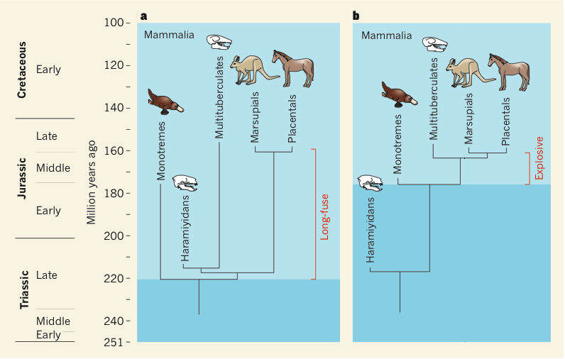 إحفوريات جديدة، تعود للعصر الجوراسي، تُسلّط المزيد من الضوء على عمليّة تطوُّر الثدييات. فقد اكتشفوا في الصين 6 إحفوريات تعود لثلاث أنواع، عاشت بالعصر الجوراسي، وكانت مجهولة حتى الآن. ويقوّل الاكتشاف الفكرة التي تقول بأنّ أوائل الثدييات قد ظهرت خلال العصر الثلاثي. وقد نُشرَتْ النتائج في مجلة الطبيعة Nature. بعض الإحفوريات من حيوانات بحرية وحيوانات قد عاشت على اليابسة خلال العصر الترياسي يقود جزء من البحث الأخصائي Jin Meng، والعامل في متحف العلوم الطبيعية في الولايات المتحدة الأميركية. حيث يعتبر أن الإحفوريات تعود لثلاث حيوانات تنتمي للمجموعة المُنقرضة المسماة haramíyidos، وهي تتصل بنوع من القوارض ذات التكيف الناجح، وربما أعطت تلك العلاقة أصل الثدييات الخاضع للنقاش دوماً. يعتبر الباحثون بأنّ المجموعة haramíyidos، تُعتبر من أقدم الثدييات المعروفة حتى الآن، ويرون بأنها ارتبطت بعلاقة مع مجموعة أخرى من الحيوانات المسماة اللانابيّات multituberculados، وهي علاقة يمكنها تفسير متى وكيف تطورت الثدييات فعلياً. إعادة بناء النوع haramíyidos الشجرة النشوئية التطورية للثدييات ويظهر النوعان haramíyidos و multituberculados فيها عبر الإحفوريات الثدييات الحديثة ويظهر النوع multituberculados بينها وكان الباحث Jin Meng، قد قدّم في العام 2013 تحليل هيكل عظمي لإحفور نوع haramíyido وبعمر أكثر من 160 مليون عام، ةهذا ما يقوي فكرة الارتباط باللانابيات multituberculados ويُرجع أصل الثدييات لفترة أبكر مما كان يُرى سابقاً. كذلك بيّن علماء إحاثة ألمان، في العام 2014، يعملون بجامعة بون، بأنهم درسوا إحفور يعود للنوع haramíyido، في الصين، وتوصلوا لنتيجة مفادها وجود ارتباط بينه وبين اللانابيات أيضاً. مع تلك المعلومات الجديدة، يقترح Meng الآن بأن كلا النوعين قد تطورا من " سلف مُشترك قد عاش خلال العصر الثلاثي المُتأخّر " أي منذ حوالي 208 مليون عام. كذلك يفسّر التفرُّعات الأوليّة بين مجموعات الثدييات المتنوعة، كالثدييات البيّاضة { تضع بيوض } من جانب، والثدييات الجُرابيّة والمشيميّة من جانب آخر، وبأنها أقدم بكثير مما كان يُرى سابقاً. إعادة بناء أحد أقدم الثدييات يتبع ![]() ![]() |