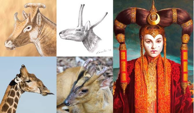كيف قاد التطوُّر لامتلاك الزرافة عنق بهذا الطول الهائل لطالما لفت طول عنق الزرافة الهائل أنظار العلماء والعامّة. فكيف اكتسبت تلك الحيوانات، عبر التطوُّر، هذا الملمح التشريحي بالغ الخصوصية هذا؟ توضيح ازدياد ونقص طول الرقبة ضمن عائلة الزرافات. يُشار للإسم، ولملايين السنوات للوراء. يكونا الأكاب والزرافة النوعان الراهنان الباقيان على قيد الحياة. صورة Nikos Solounias و Melinda Danowitz منذ زمن طويل، أنّ هذا العنق قد تطوّر ليسمح للزرافة ببلوغ أوراق اشجار عالية تتغذى عليها أو كمنهج متخصص بالصراع للبقاء على قيد الحياة. تُبيِّن دراسة جديدة على الفقرات العنقية الإحفورية، حققها فريق بحث بقيادة Nikos Solounias الأخصائي بتشريح الزرافة وعالم إحاثة عامل بمعهد نيويورك التقني، بأنّ تطوّر العنق للزرافة قد حدث على عدّة مراحل في الغالب، حيث تطاولت فقرات العنق باتجاه الرأس بداية وباتجاه الذيل لاحقاً بعد مرور مليون عام تقريباً. تُظهر نتائج البحث، للمرة الأولى، التفاصيل الدقيقة للتغيُّر التطوريّ عند كائنات مُنقرضة تنتمي لعائلة الزرافات. درسوا 71 إحفور لتسع أنواع منقرضة ونوعين على قيد الحياة من الزرافات. جرى حفظ العظام المكتشفة بنهايات القرن التاسع عشر وبدايات القرن العشرين في عدّة متاحف على امتداد العالم، بما فيها متاحف في بريطانية، استراليا، ألمانيا، السويد، كينيا واليونان. اكتشفوا أنّ الزرافة الأكثر بدائيّة قد بدأت مع عنق قليل الطول. بدأ يزداد طول العنق حتى قبل ظهور عائلة الزرافات الراهنة بحوالي 16 مليون عام. الأكاب أتى الاكتشاف الرئيسيّ بعد تحليل المزايا التشريحية للإحفوريات المختلفة ومقارنتها مع الشجرة التطورية. ففي حين ازداد طول رقبة الزرافة، قد قلّ طول رقبة عضو آخر ينتمي لهذه العائلة. إثر مرور ملايين الأعوام من التطور، في حين يحافظ الأكاب الذي يعيش بأفريقيا حالياً وينتمي لعائلة الزرافات على اختلافه عن الزرافة التقليدية سيما بطول الرقبة. تُسلّط إحفوريات حيوان مجترّ مُنقرِضْ الضوء على تطوُّر الزرافات تُشكّل الحيوانات المجترة القديمة Los paleomerícidos مجموعة من ذوات الحوافر الغامضة التي عاشت خلال عصر الميوسين، منذ ما بين 17 و 11 مليون عام. عاشت في أوروبا وآسيا بصورة حصرية، حيث انتشرت اعتباراً من شبه الجزيرة الايبيرية إلى الصين اليوم. يمكن توصيفها كنوع مختلط يقع بين الغزلان والزرافات. درس فريق بحث إسباني مجموعة من الإحفوريات التي تعود لحيوان مجتر قديم، عثروا عليها في موقع حفريات Retama في كوينكا { بعمر قد بلغ 16 مليون عام }. أطلقوا على هذا الحيوان اسم Xenokeryx amidalae { ويعني " القرن الغريب لبادمي أميدالا " } نظراً لشبهه لتصفيفة شعر أميدالا. سمحت إحفورياته المحفوظة جيداً بتحديد سلالة هذه الحيوانات المجترة القديمة بوصفها شقيقة للزرافات. نشروا نتائج البحث في آخر عدد من مجلة PLOS ONE. أشارت نتائج البحث لأنّ هذا الحيوان المجتر القديم والزرافة قد امتلكا سلفاً مشتركاً لا يُشبه أيّ حيوان مجتر آخر. يسمى كلا الخطين التطوريين ما أسميناه مزدوجات الأصابع Giraffomorpha { حيوانات مجترة ذات مظهر زرافاتي }، وقد انفصلا منذ زمن طويل، منذ ما يقرب من 27 مليون عام. لم يسمح لنا هذا النوع القديم بتحقيق معرفة أكبر حول المجترات التي ينتمي لها فقط، بل كذلك وفّر لنا معطيات بالغة الاهمية حول الأصل والتاريخ الباكر للخط التطوريّ لواحدة من عائلات المجترات الأكثر غرابة بالوقت الراهن: الزرافات. امتلك ذكور هذا المجتر القديم أنياب كبيرة ونوع خاص من الزوائد القرنية المخروطية المغطاة بالشعر حول العيون كما هو الحال عند زرافات اليوم. ما يكون أكثر غرابة في بنيتها التشريحية هو بروز بنية عظمية متشعبة بالجزء الخلفي من الجمجمة كتصفيفة الشعر، تكون وظيفة تلك الزوائد لغزاً حتى الآن بالنسبة لعلماء الإحاثة. على مدى السنوات الأخيرة، جرى التفكير بأنّ أقارب هذا النوع المجتر الأقرب قد كانت مجترات أميركية شمالية، وهي مجترات أخرى امتلكت تصفيفة شعر. وشكّل هذا مشك
