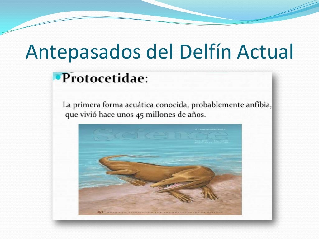 ظهر منذ ما يقرب من 95 مليون عام سَلَفْ الدلافين الحاليين الأبعد المدعو Mesonix { في الصورة أعلاه، رسم له } في الأرض. السلف البرّي الأقرب الذي عاش منذ ما يقرب من 50 مليون عام اضطر هذا الحيوان لخوض غمار مياه البحر لتحصيل طعامه، وخلال 30 مليون عام، بدأ هذا الحيوان بالتكيُّف مع البيئة المائيّة الجديدة، وقد تغيّرت القوائم الأماميّة لزعانف، فيما اختفت القوائم الخلفية { تحضر اليوم كبقايا موجودة بحوض الدلفين وتقدّم بصمة ماضيه البرّي }. يُعتبر هذا أحد أسلاف الدلافين ويعود لما قبل 45 مليون عام هكذا يصبح السلف منذ حوالي 40 مليون عام السلف منذ 25 مليون عام تظهر الدلافين الحديثة منذ ما يقرب من 15 مليون عام تطوُّر الدلافين، في سياق تطور كائنات حيّة أخرى وانقراض أخرى. أوضح معهد طوكيو للتكنولوجيا عن تطويره لطريقة جديدة تتوخّى قراءة التاريخ الوراثيّ للدلافين، وذلك من خلال دراسة تسلسل الحمض النووي DNA، وقد دُرسَ التسلسل لعناصر قصيرة أسموها SINEs وعناصر طويلة أسموها LINEs، والتي بيّنت نتائج دراستها، أنّه بمُجرّد تواجدها في جينوم الحيوان، فستفيد بمعرفة أصوله التطوريّة. بيّنت النتائج وجود علاقة قرابة لصيقة بين الدلافين والأبقار، الغزلان، الزرافة والخنزير، الذي ربما يُعتبر الأقرب تطورياً للدلافين، حيث امتلكت جميعها ذات العناصر SINEs وLINEs. تعمل أقسام المعدة الثلاثة عند الدلفين بصورة مشابهة لعمل الأقسام الأربعة بمعدة البقرة، وربما يضيف هذا دليل على ارتباط تطوريّ بينهما. جرت متابعة الدراسة الوراثيّة في Texas A & M University من قبل الدكتور Dr. David Busbee وفريقه، وقد اكتشفوا بأن الدلافين والبشر، يتقاسمون كثير من التشابهات الصبغية الكروموزوميّة، ويكونا جينوميهما متشابهان جداً. يمتلك كل كروموزوم عند الدلفين كروموزوم مُقارَنْ عند الكائن البشريّ. |
