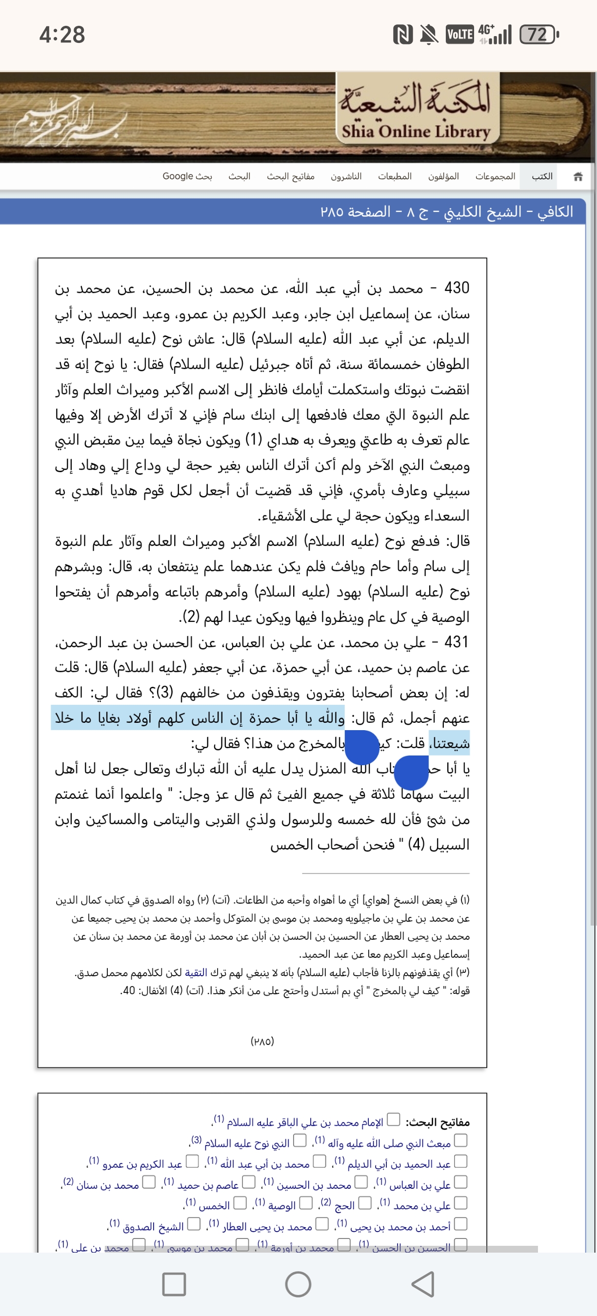 اولا سأقوم بالاستشهاد بعدة كتب كتاب الكافي (احد الكتب الاربعة الاساسية في العقيدة الاثناعشرية وتدرس في الحوزات) ومحمد باقر الصدر كان يشرح هذا الكتاب لطلابه في الحوزة كتاب تهذيب الأحكام (هذا ايضا من الكتب الأربعة الاساسية في تدريس الحوزة) مجلد بحار الأنوار (موسوعة الزامية للباحث الشيعي) تحرير الوسيلة للخميني (في مناهج الحوزة العلمية في قم) هذي المصادر الان نبدأ ![]() الكافي الجزء الثامن صفحة 285 اقتباس:
