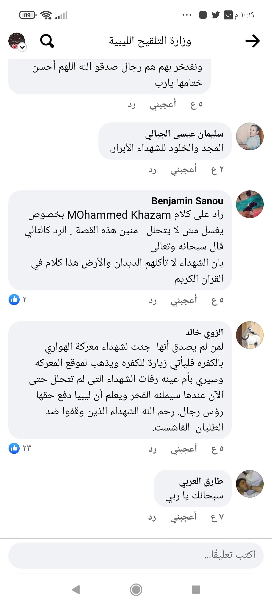 يا جماعة انظرو للتوثيق لاي درجة يصل هذه صورة لشخص على الفيس بوك يقول لكم تعالو الى مدينة الكفرة في ليبيا لتشاهدو هذه الكرامة يتحدى بوثوق وقوة يتحدى لترو العديد من جثث الشهداء وطبعا انا طرحت اول الموضوع انه يوجد العديد من الجثث وليست جثة واحدة لمن اراد ان يذهب ويرى بعينه مابعد هذا ايها الكفار والملحدون ![]() |